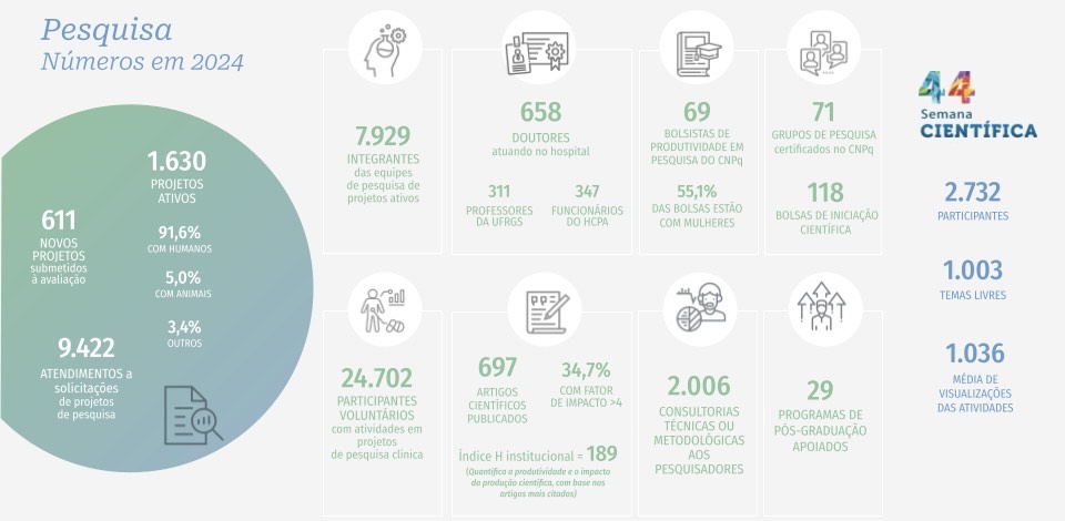 Acima estão os principais números da pesquisa do Hospital de Clínicas de Porto Alegre em 2024 (fonte - Relatório de Gestão do HCPA).